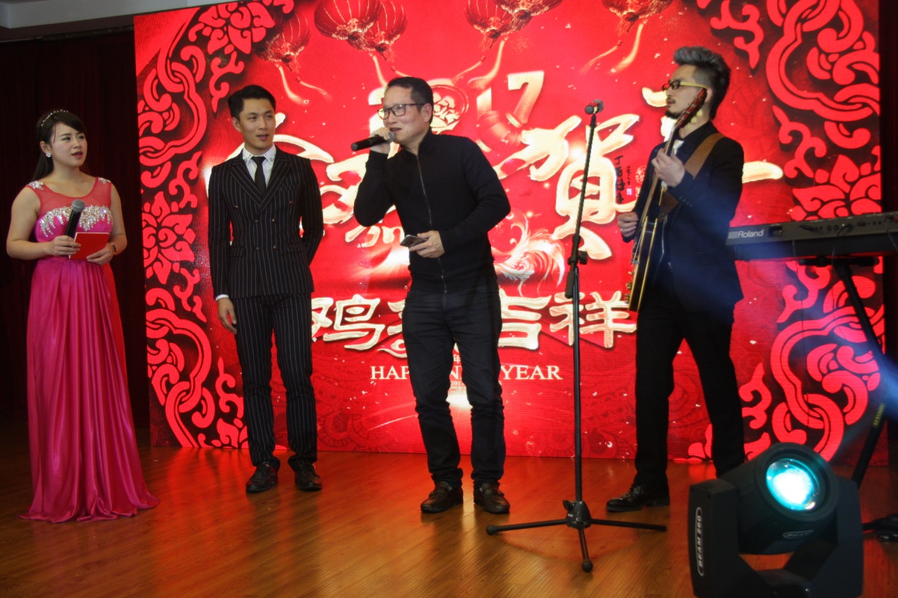集團(tuán)公司王副董長(zhǎng)代表集團(tuán)董事會(huì)致新春賀詞。王董回顧并肯定了過(guò)去一年的工作,衷心感謝全體員工一年來(lái)的辛勤工作,正因?yàn)橛忻總€(gè)人默默奉獻(xiàn)、忘我地工作,才實(shí)現(xiàn)了公司不斷發(fā)展。在新的一年里,機(jī)遇與挑戰(zhàn)并存,王董希望廣大員工繼續(xù)發(fā)揚(yáng)開(kāi)拓進(jìn)取的精神,“不忘初心,砥礪前進(jìn),擼起袖子加油干”,為公司的發(fā)展再立新功。王董最后祝大家新年快樂(lè)!萬(wàn)事如意!全場(chǎng)共同舉杯,為全新的2017!干杯!